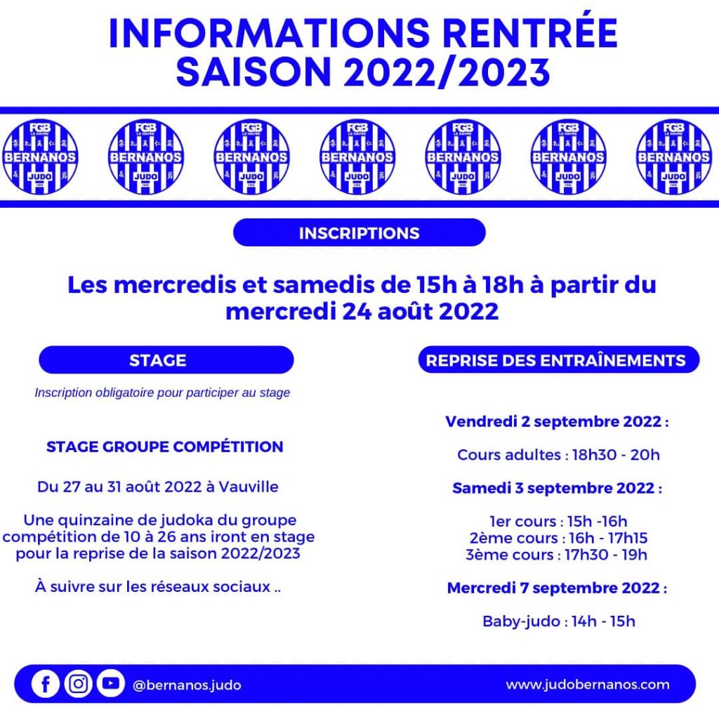 Quelques informations sur la saison 2022/2023 qui arrive.. date et horaires des inscriptions, planning de la reprise des entraînements ainsi que le stage du groupe compétition. On se retrouve cette semaine pour cela